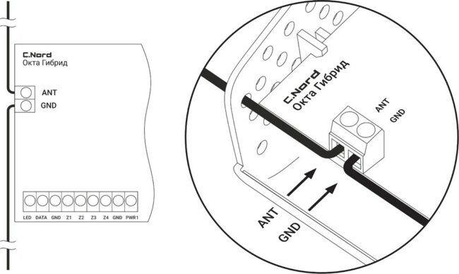 - Резервную антенну направьте вверх, выведите наружу через отверстие в корпусе прибора и подсоедините к клемме ANT.
