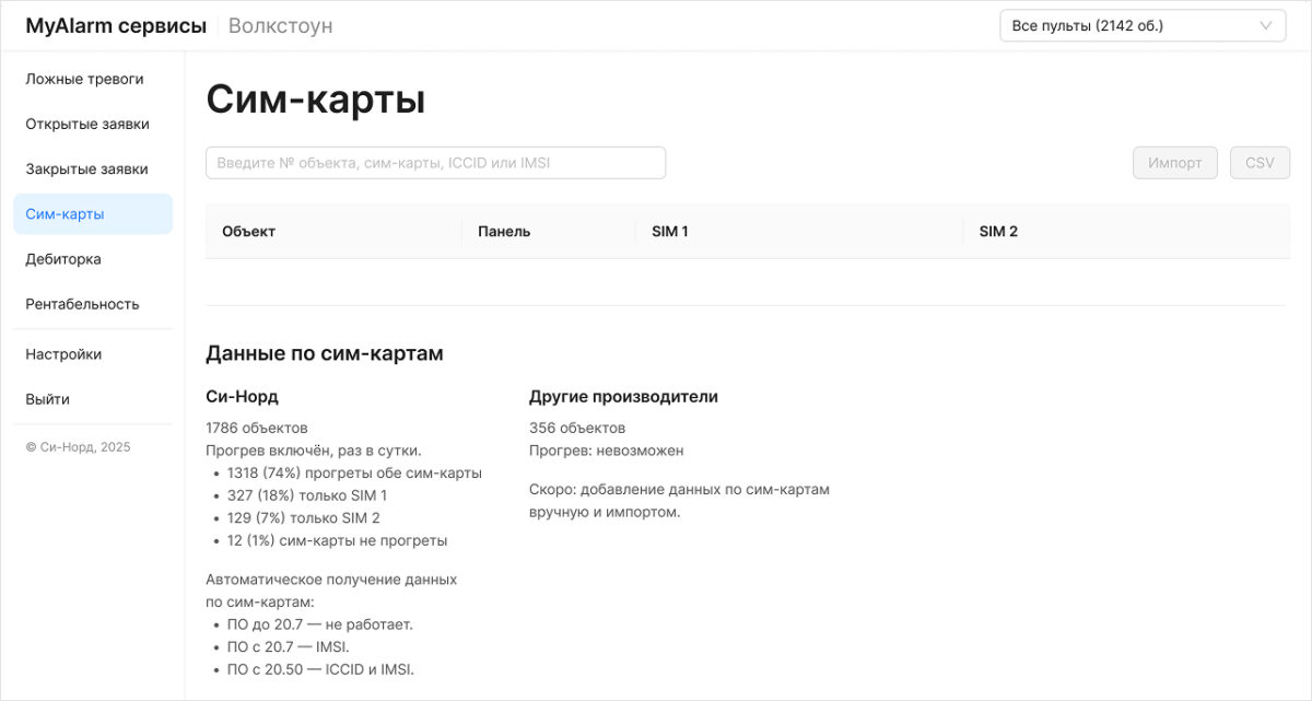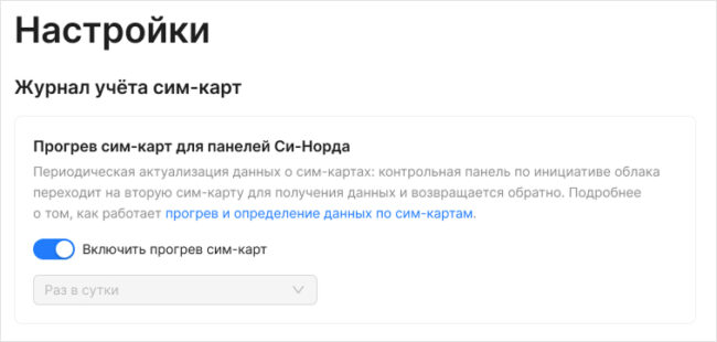 Чтобы активировать функцию в Платформе MyAlarm, перейдите на вкладку «Настройки» → блок «Учёт сим-карт» → включить «Прогрев сим-карт для панелей Си-Норда»