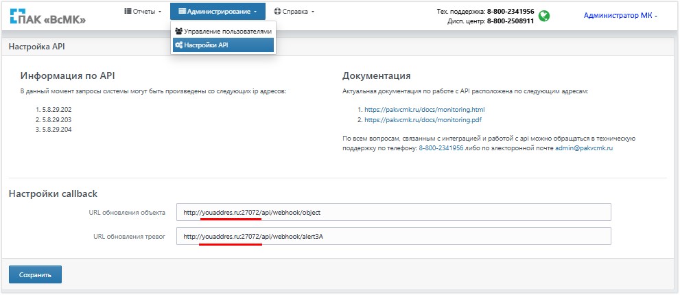В веб-версии ПАК ВсМК под аккаунтом Администратора откройте раздел Администрирование → Настройки API. Укажите ваш адрес и порт для получения данных от ПАК ВсМК. Сохраните изменения.
