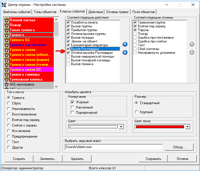 Добавьте действия по вызову и отмене Росгвардии в модуле «Настройки системы» к нужным классам событий. И сохраните изменения: