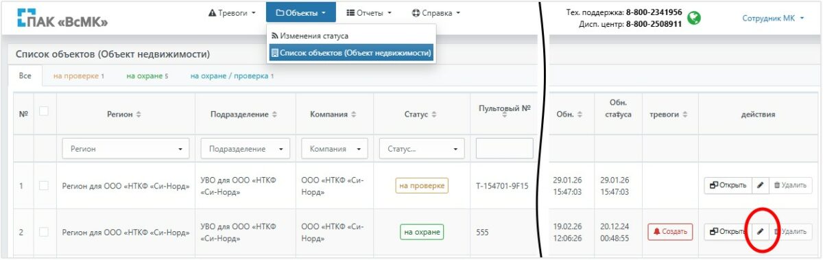 Под аккаунтом сотрудника в веб-версии ПАК ВсМК откройте список объектов, по номеру объекта найдите нужный и откройте его редактирование: