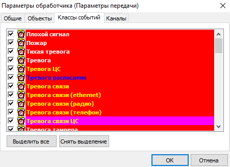 3. На вкладке «Классы событий» выбираем необходимые для передачи классы событий или выделяем все.
